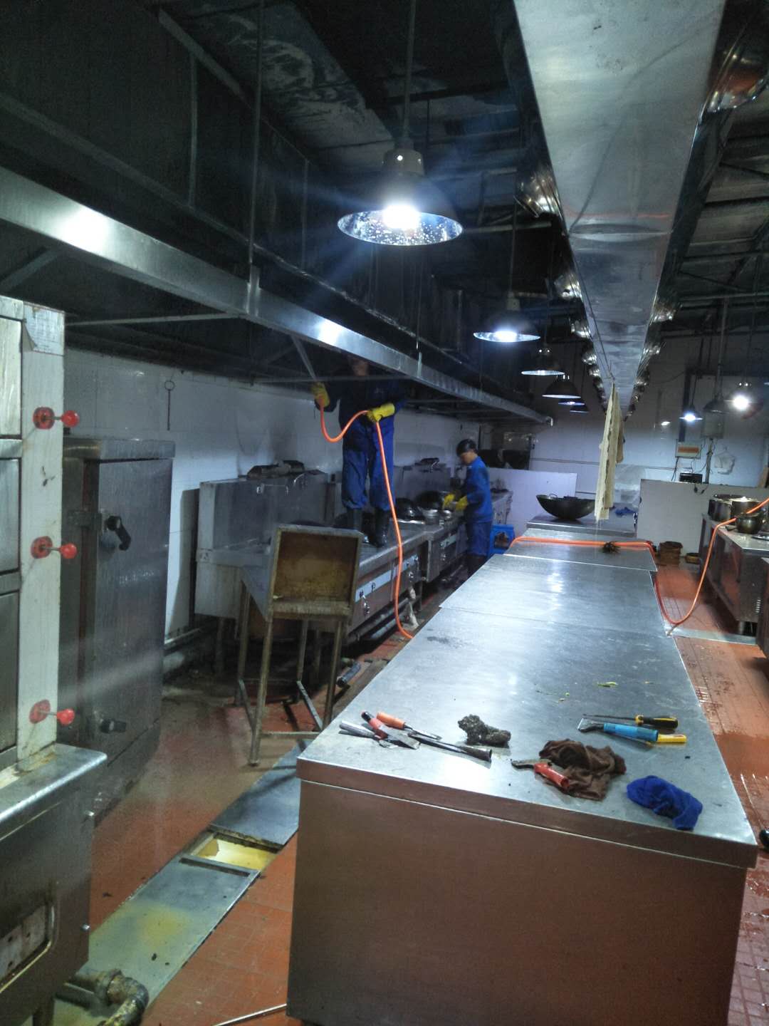煙道是賓館、酒樓廚房的基礎(chǔ)設(shè)施,極易藏污納垢,是清理的死角。同時(shí)煙道是消防、衛(wèi)生、防疫部門(mén)檢查的重點(diǎn)區(qū)域.煙道、煙罩若不經(jīng)常清洗,積油越積越多,順著煙罩自然倒流,不僅影響飯菜質(zhì)量,而且還有損酒店信譽(yù)。同時(shí),煙道中易寄生老鼠、蟑螂,不符合國(guó)家衛(wèi)生標(biāo)準(zhǔn).油膩膠狀物長(zhǎng)期扒附在金屬表面,還會(huì)腐蝕金屬材料,縮短煙道使用壽命。由于酒店食堂廚房排煙罩因長(zhǎng)期積油,煙道、煙罩常年處于高溫工作環(huán)境,油煙氣化形成積油、積炭或油膩的膠狀物。很容易引起火災(zāi)。使用專(zhuān)用的煙道、煙罩清潔劑,對(duì)煙道金屬材料清潔后,能在材料表面附著一層保護(hù)膜.在攝氏80度時(shí),自動(dòng)散發(fā)二氧化碳阻止燃燒.徹底解決客戶(hù)的后顧之憂(yōu)。