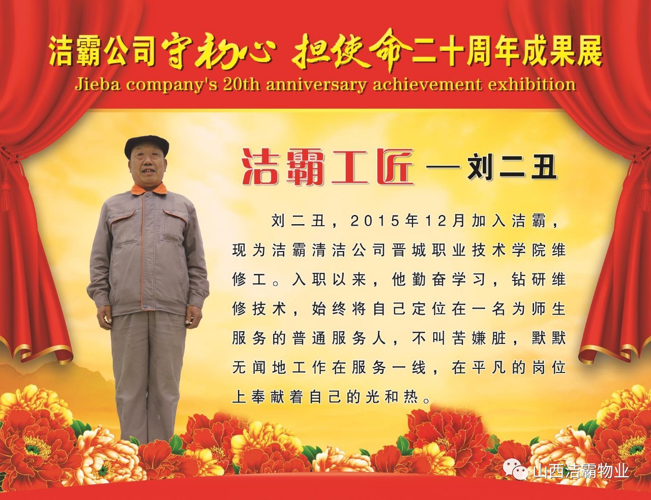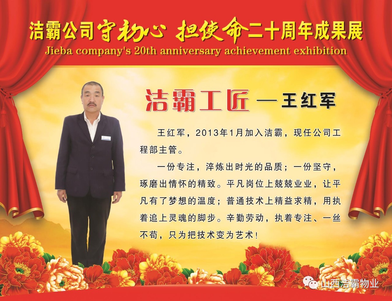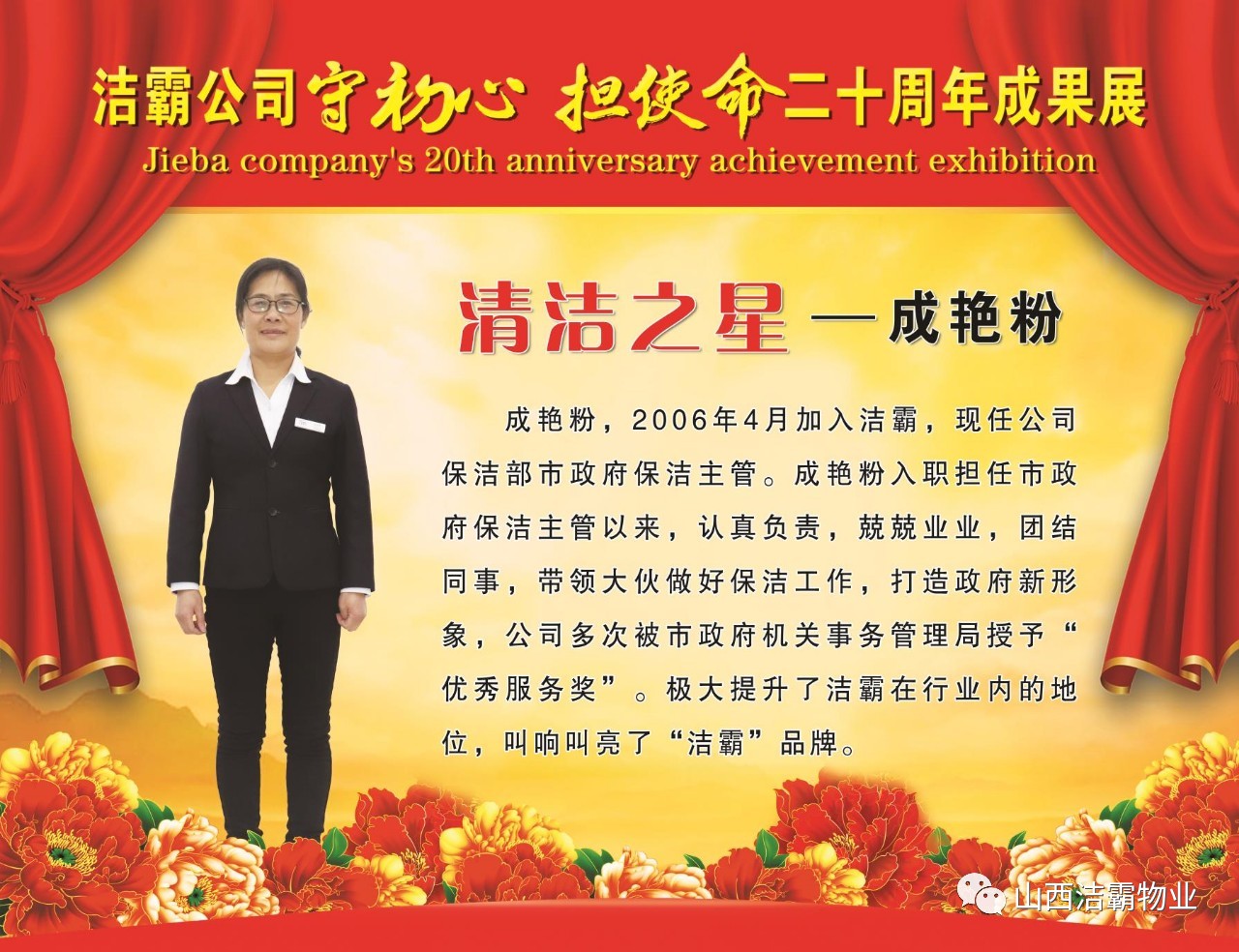 本次晚會以“潔霸二十華彰,感恩共創(chuàng)輝煌”為主題,此次慶典的核心思想是“感恩”,主要角色是潔霸的創(chuàng)業(yè)者。為此,公司對入職潔霸的創(chuàng)業(yè)功勛和一線員工進(jìn)行了表彰獎勵。本次晚會共設(shè)8個獎項(xiàng),包括“潔霸先鋒”“奉獻(xiàn)之星”“管理之星”“潔霸管家”“潔霸工匠”“清潔之星”“潔霸衛(wèi)士”“園藝之星”等。他們是:李山虎、張永智、史志霞、陳福林、王紅軍、余艷青、劉二丑、成艷粉、楊改梅、王書玲、張國榮、耿竹青、張粉霞、宋秋苗、陳先梅、張晉平、張偉山、趙瑞軍、王廣平、郭志云。晉城市原副市長成育廷、晉城市商務(wù)局原局長王新善、晉城市非公和社會組織工委書記郎軍芳、晉城市婦聯(lián)三級調(diào)研員李蓮菊、晉城市總工會商貿(mào)輕紡煙草服務(wù)業(yè)工會主席張玉濤、晉城市城區(qū)財(cái)政局局長翟明太等領(lǐng)導(dǎo)為他們頒獎。