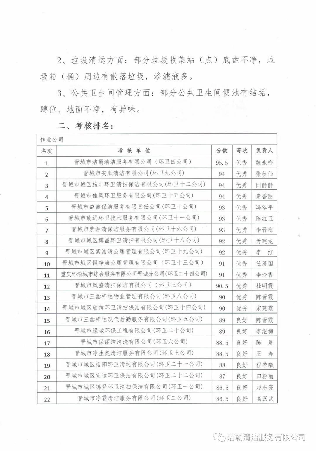 2020年10月28日—10月30日,晉城市城區(qū)市容環(huán)衛(wèi)中心由中心督查室牽頭組織,中心班子成員分別帶隊,機關(guān)全體人員參加,對各作業(yè)公司道路清掃路段、垃圾收集站(點)和公廁采用交叉檢查和隨機抽查的方式對24個作業(yè)公司的環(huán)境衛(wèi)生作業(yè)質(zhì)量和4個監(jiān)理公司的日常檢查情況進行了考核。晉城市潔霸清潔服務(wù)股份有限公司所屬的環(huán)衛(wèi)四公司分數(shù)最高,名列第一。