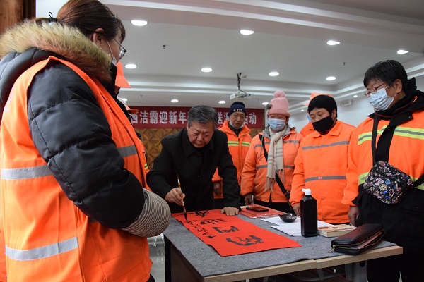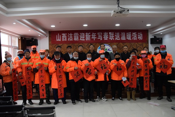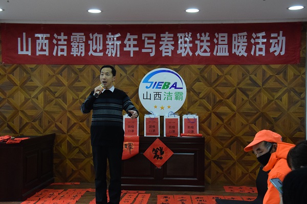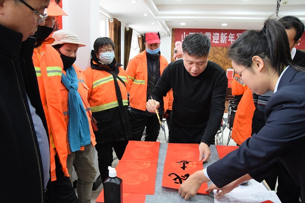 現(xiàn)場(chǎng)人頭攢動(dòng),熱鬧非凡,處處洋溢著歡樂(lè)喜慶的氣氛。賈大一老師剛執(zhí)墨筆,就吸引了現(xiàn)場(chǎng)數(shù)十名員工駐足觀賞。他的書(shū)法如行云流水,一副寓意著對(duì)新年美好祝福的春聯(lián)便一氣呵成。各位老師揮毫潑墨,一幅幅散發(fā)著清新墨香的春聯(lián)展現(xiàn)在大家面前!懊坊í(jiǎng)”獲得者張保平老師現(xiàn)場(chǎng)演唱上黨梆子戲曲名段,字正腔圓,渾厚豪邁,把活動(dòng)推向了高潮。市總工會(huì)副主席韓敦峰為員工分發(fā)了對(duì)聯(lián)和防疫口罩。