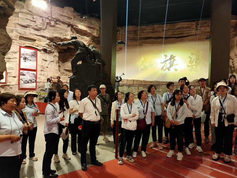 走進(jìn)紅旗渠紀(jì)念館,大家跟隨講解員的腳步,在千年旱魔,世代抗?fàn);紅旗引領(lǐng),創(chuàng)造奇跡;英雄人民,太行豐碑;山河巨變,實現(xiàn)夢想;繼往開來,精神永恒五個部分逐一駐足學(xué)習(xí),通過一件件珍貴的物品,一幅幅生動的圖片、一幀幀震撼的畫面、一個個感人的故事,讓大家身臨其境感受到林州人民建造人工天河時不畏艱險,頑強(qiáng)拼搏,緊靠一錘一鏟削平1250座山頭、鑿?fù)?11個隧道、架設(shè)151個渡槽的恢弘場景。在場的各位都深深地被“自力更生、艱苦創(chuàng)業(yè)、團(tuán)結(jié)協(xié)作、無私奉獻(xiàn)”的紅旗渠精神所感動,切實感受到中華民族勤勞堅韌的優(yōu)良傳統(tǒng),領(lǐng)悟社會主義是干出來的,新時代是奮斗出來的。