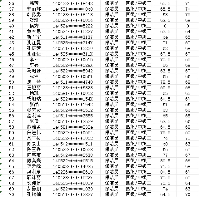晉城市潔霸清潔服務(wù)股份有限公司職業(yè)技能等級認定中心現(xiàn)將2024年1月20日認定人員成績公示如下: