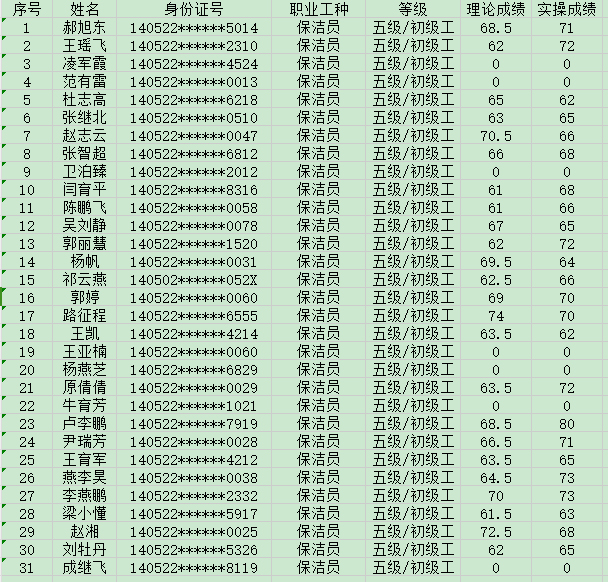 晉城市潔霸清潔服務(wù)股份有限公司職業(yè)技能等級認定中心現(xiàn)將2024年8月24日認定人員成績公示如下:
