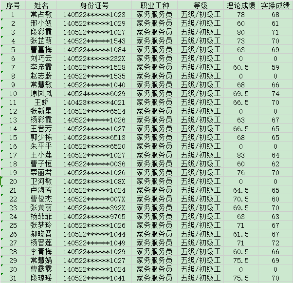 2024年8月31日第33批家政服務(wù)員初級認定人員成績公示